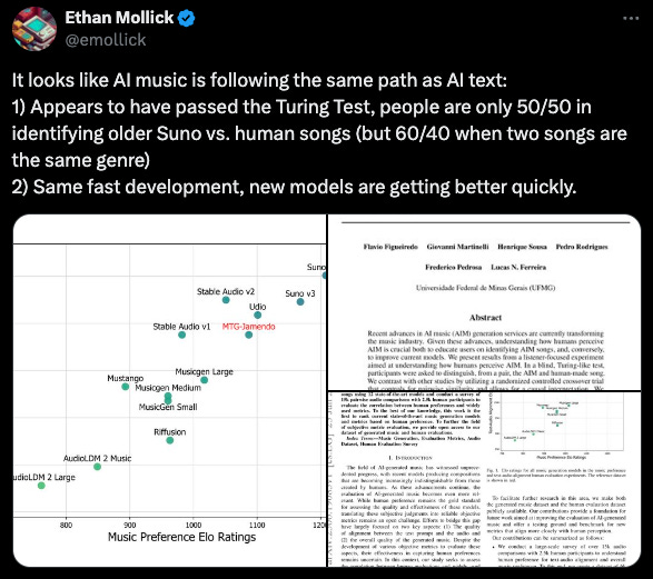 Here’s the research noted above. And a related piece in Scientific American. More generally, audiences tend to vary widely in listening expertise. For example, the paper notes longer practical musical experience (over five years) significantly increased the chance of correct identification, as did prior knowledge of AI-generated music. Nonetheless, it’s a good opportunity to reflect on the cues we rely on to make distinctions.